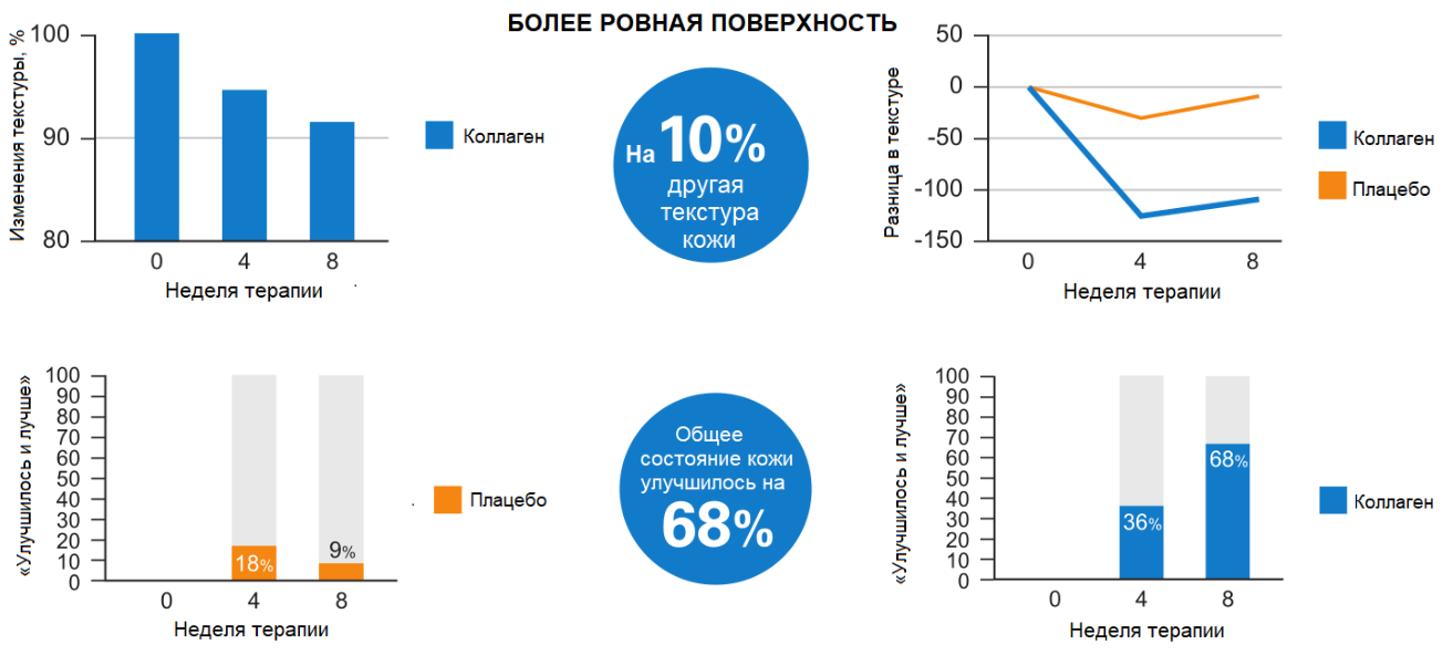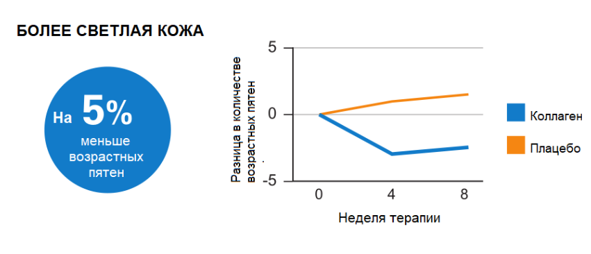 Результаты. В группе плацебо число возрастных пятен имело тенденцию к увеличению на 3 %. В группе коллагена количество возрастных пятен уменьшилось за 4 недели по сравнению с данными до терапии (0 недель).