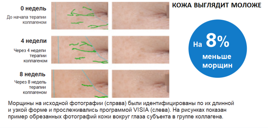 Результаты. Количество морщин уменьшилось на 8 % после приема внутрь пептида морского коллагена в течение 8 недель, что соответствует внешнему виду кожи на 4 года моложе.